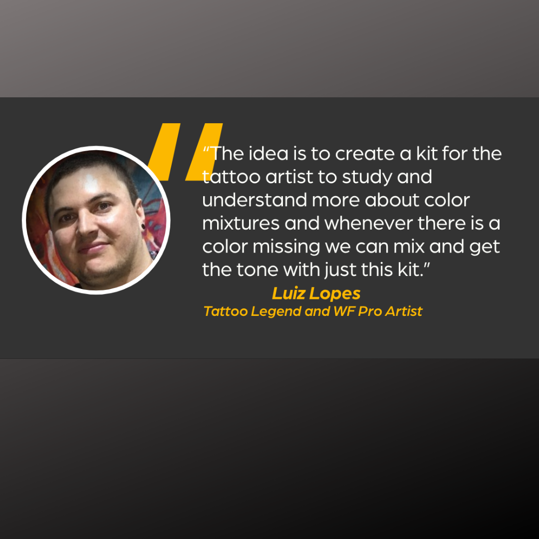 “The idea is to create a kit for the tattoo artist to study and understand more about color mixtures and whenever there is a color missing we can mix and get the tone with just this kit.” Luiz Lopes – Tattoo Legend and WF Pro Artist